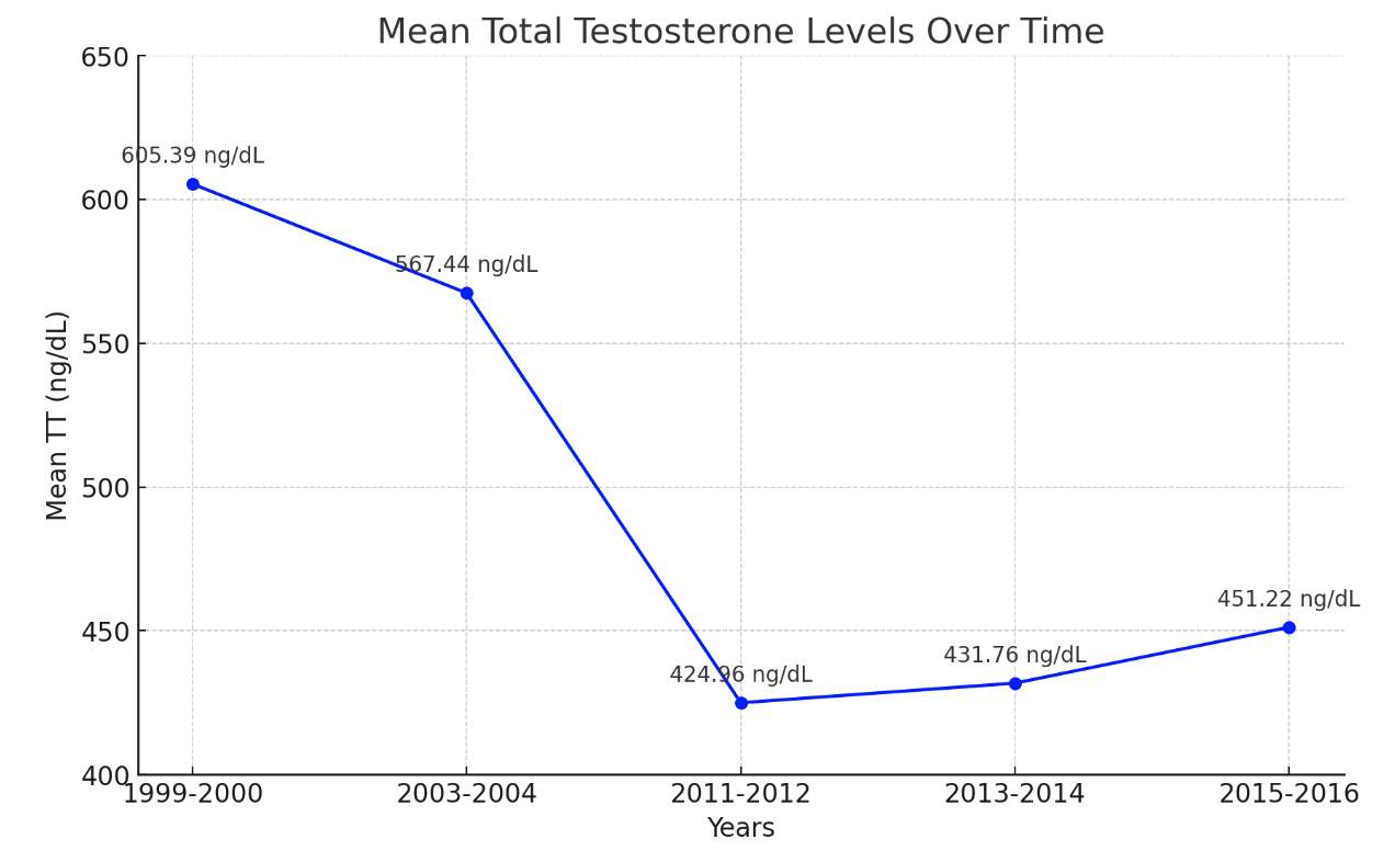 Harvard’s longitudinal data shows a 1% annual decline in testosterone since the 1980s, even when controlling for age and BMI.